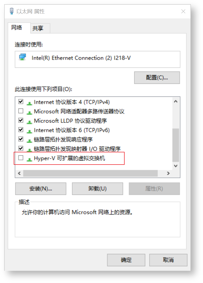 主机重启后以太网可能不可用,需要在外网网口的网络设置里取消“Hyper-V可扩展的虚拟交换机”选项,并重新配置WSL2的交换机桥接类型为外部网络。