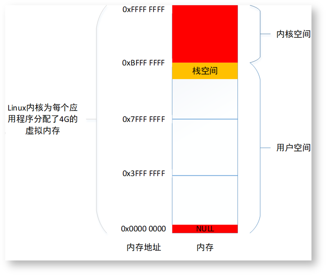 - 靠近0x00000000地址的一小部分空间进程不能使用,比如典型的NULL地址,如果往这个地址存放数据,则程序会崩溃。
