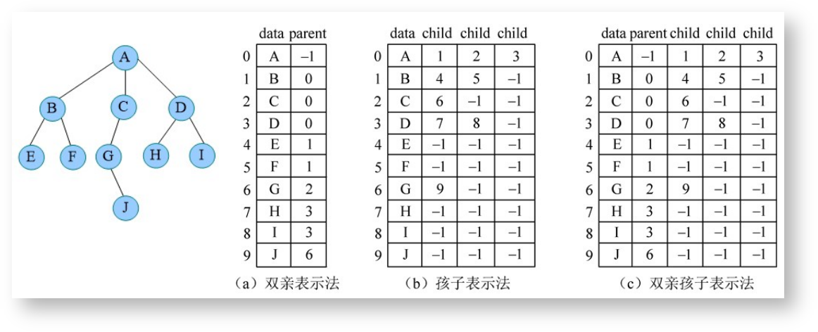 树的存储分为顺序存储和链式存储。顺序存储是指通过数组来存储树,分为双亲表示法,孩子表示法,双新孩子表示法,如下: