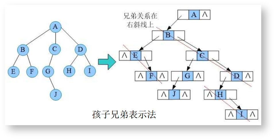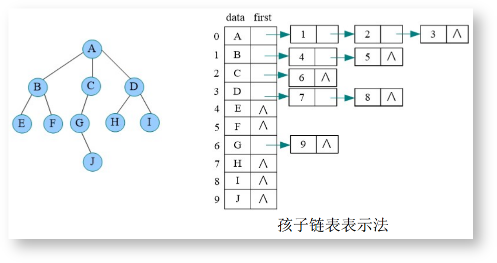 链式存储使用链表来存储树,分为孩子链表表示法和孩子兄弟表示法,如下: