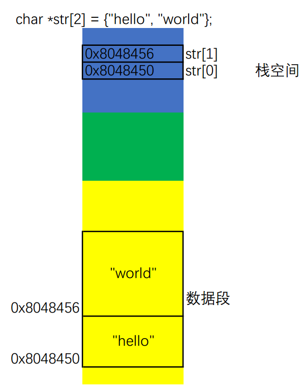 该数组的第一个元素存储的是第一个字符串的首地址,第二个元素存储的是第二个字符串的首地址,以下是它们的内存图。