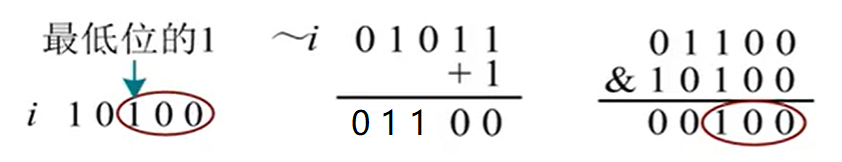 lowbit(x)的求法是x各位取反再加1,再与x本身进行与操作,比如i=20,其二进制表示为10100,取反之后为01011,加1之后为01100,再与20本身进行与操作,结果为01100&10100,得到结果为100。
