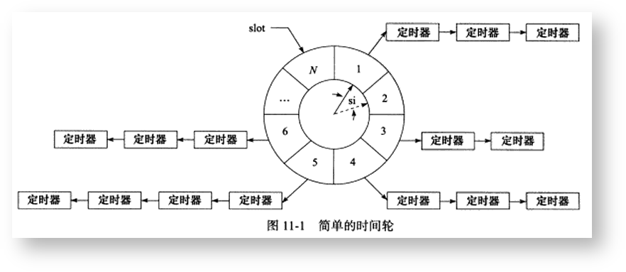 上面的时间轮包含N个槽位,每个槽位上都有一个定时器链表。时间轮以恒定的速度顺时针转动,每转一步,表盘上的指针就指向下一个槽位。每次转动对应一个tick,它的周期为si,一个共有N个槽,所以它运转一周的时间是N*si。