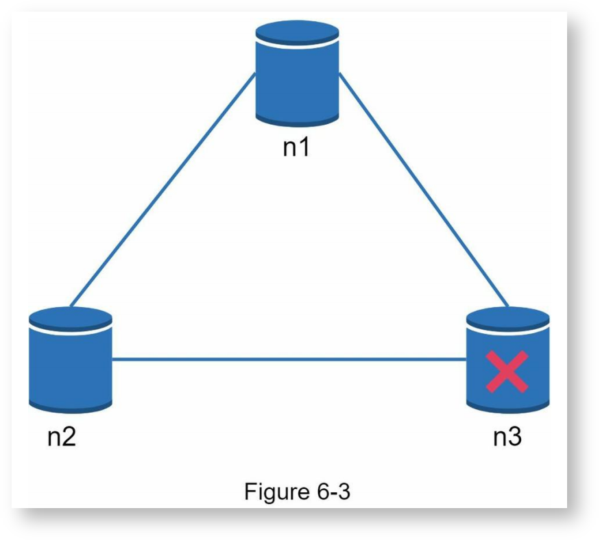 现实场景中,网络分区无法避免,当某个结点发生网络分区时(并不一定是宕机和停止服务,也可能只是单纯因为网络问题导致与其他结点无法通信,而结点本身仍然是处于正常状态的),系统必须在高可用性和高一致性之间作出选择,这里以n3出现故障为例进行说明: