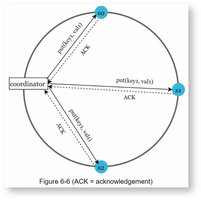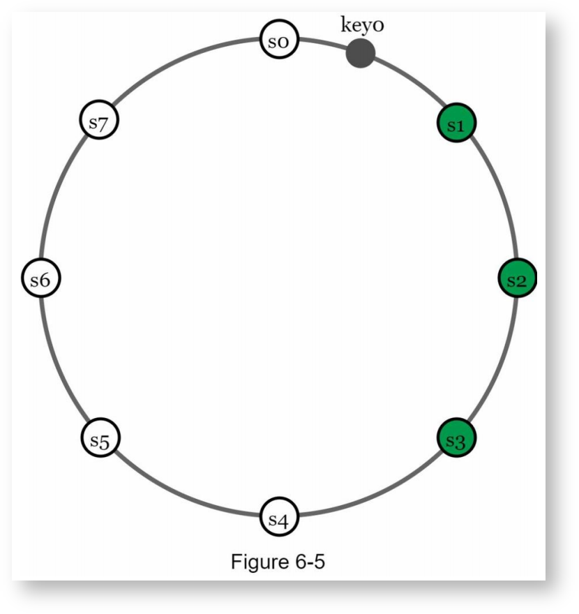 - 当把key映射到哈希环上后,按顺时针方向选择前N个服务器进行存储,比如在下面的示例中,N=3,key0被存储在s1,s2,s3中。
