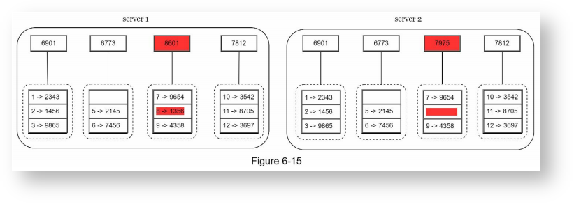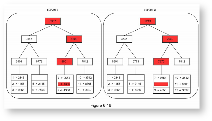 哈希树的生成过程如下,这里以两台服务器,每台服务器存储了12个数据为例,标记为红色的结点是两台服务器上不一致的数据:
