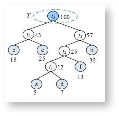 约定左分支上的编码为"0",右分支上的编码为"1",从根结点到叶子节点路径上的字符组成的字符串就是该叶子节点的哈夫曼编码。以下为上面表格中字符的哈夫曼编码树(权值放大了100倍,方便处理):