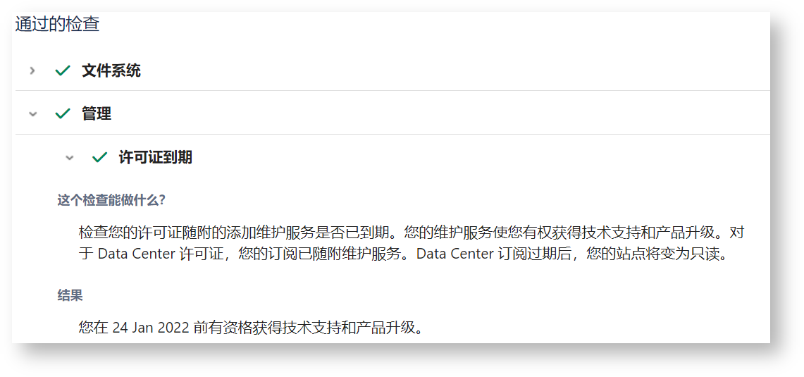 1. 确定是否有资格升级到新版本。Confluence购买的每个许可证都带1年的维护期,在维护期内可升级到最新版,超过维护期后不支持升级到新版,需要先延保,再升级。可在 站点管理-> 故障排除和技术支持工具 查看是否在维护期内,如下: