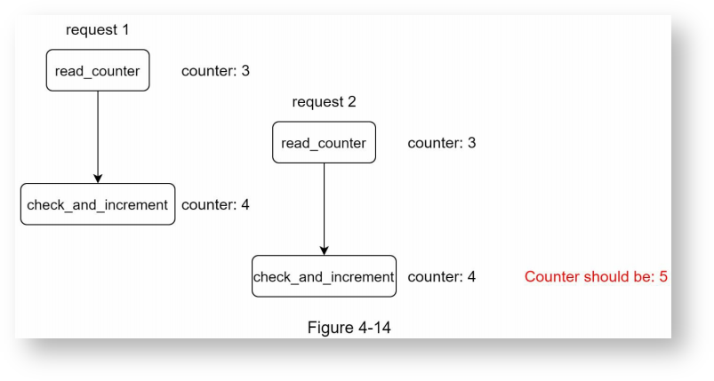 发生在读-判断-写回过程,两个独立的读-判断-写回语句可能发生重叠,导致最终结果不正确,如下: