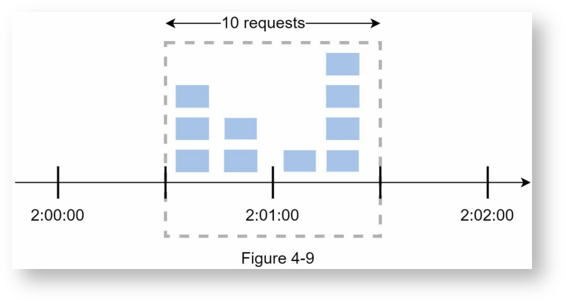上面的固定窗口是1分钟,流量上限是5,从2:00:00~2:01:00和2:01:00~2:02:00这两个时间段来看,流量都没有超出限定值,但是从2:00:30~2:01:30这个时间段来看,流量是10,超出了限定值。