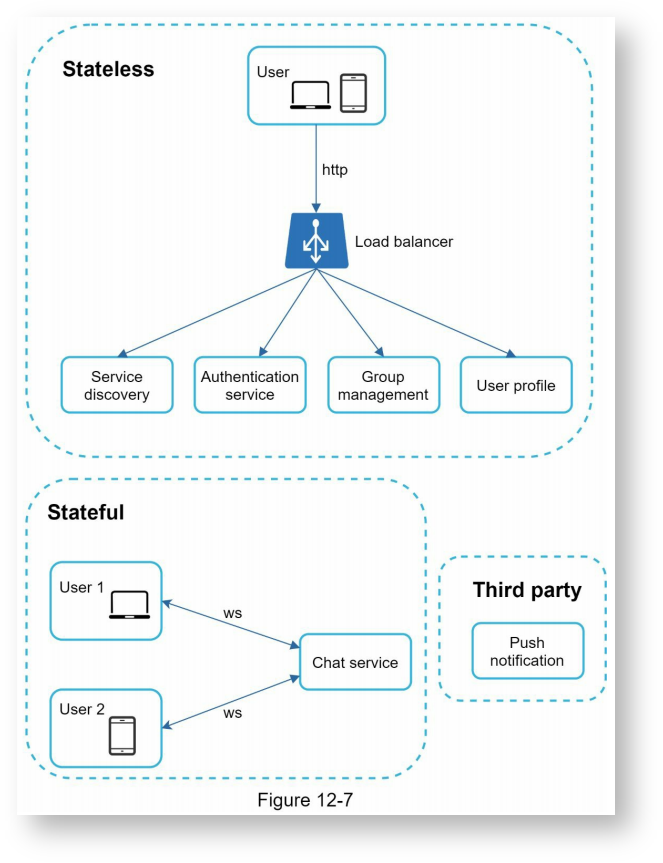 整个系统包含三部分:无状态服务,有状态服务,第三方服务。服务端和客户端之间的双向连接采用WebSocket实现,但是像其他功能,比如登录,注册,获取用户配置等还是可以使用传统HTTP基于请求/响应模型进行实现。