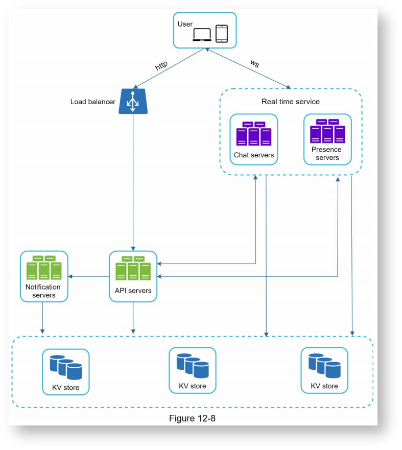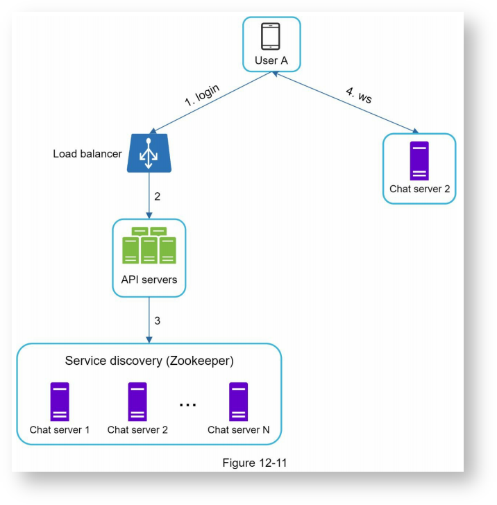 只包含聊天服务。客户端与聊天服务器需要保持长连接,并且只要当前聊天服务器可用,客户端就不会切换服务器。服务发现功能可用于协调聊天服务以避免服务器过载。