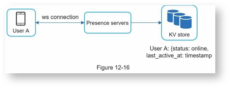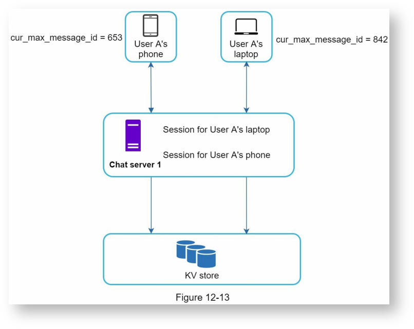 这里用户A有两个设备:手机和笔记本电脑。当用户通过手机登录时,手机APP和聊天服务器1之间建立一个持久的WebSocket连接。同样,在用笔记本登录时,笔记本电脑也和服务器1有一个持久的WebSocket连接。