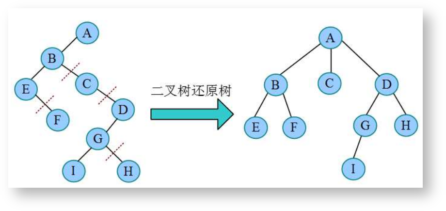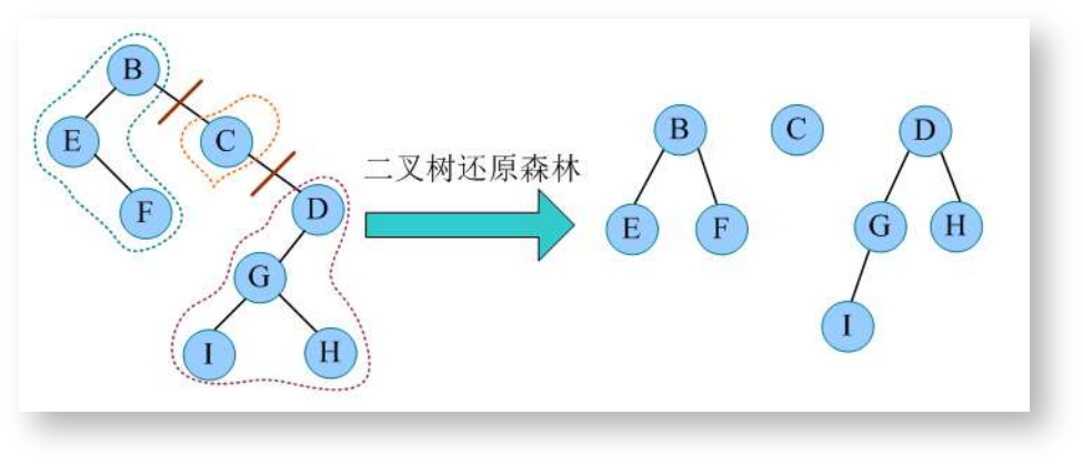 右斜线上的每个结点作为一棵树的根,将每棵二叉树还原为树。