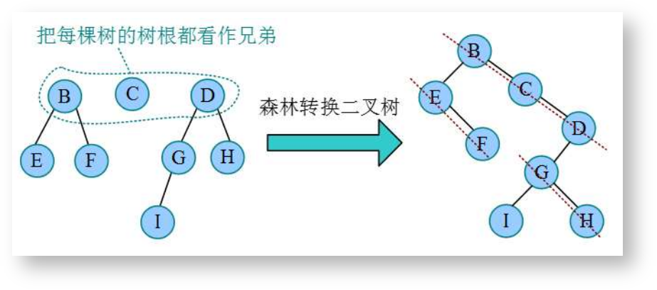 把森林中的每棵树的根当成兄弟结点,先把每个树转换成二叉树,然后再将每棵树的根连接在右斜线上。