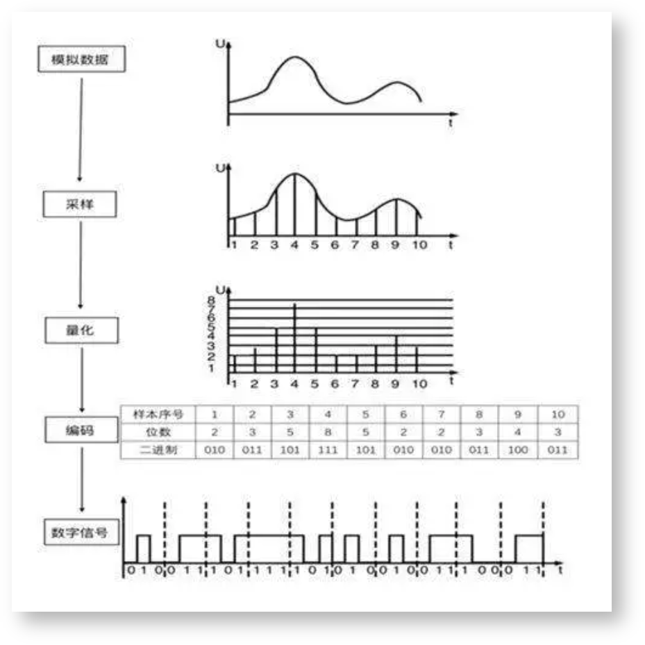 PCM,Pulse-code modulation,脉冲编码调制,代表的是原始音频数据,也就是无损音频数据,未压缩,且未包含额外的封装信息,参考以下音频量化过程,最后生成的二进制数据就是音频PCM编码数据: