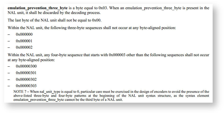 - 在一个NAL单元内,如果一个4字节序列的前3字节是0x000003,那么它只能是0x00000300、0x00000301、0x00000302、0x00000303中的一种,不可能是其他组合。