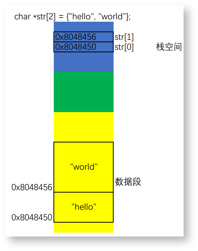 该数组的第一个元素存储的是第一个字符串的首地址,第二个元素存储的是第二个字符串的首地址,以下是它们的内存图。
